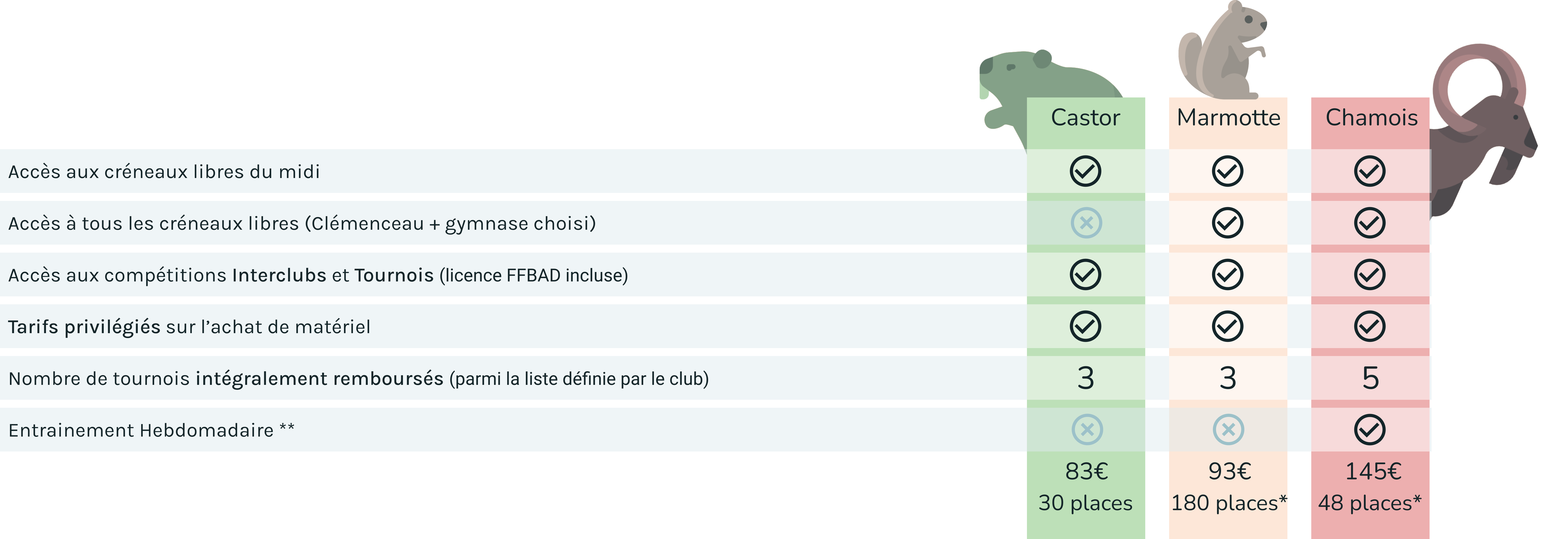 Pour permettre a tout un chacun de s’y retrouver dans sa pratique du badminton, 3 packs avec des tarifs différents sont proposés aux adhérents.
